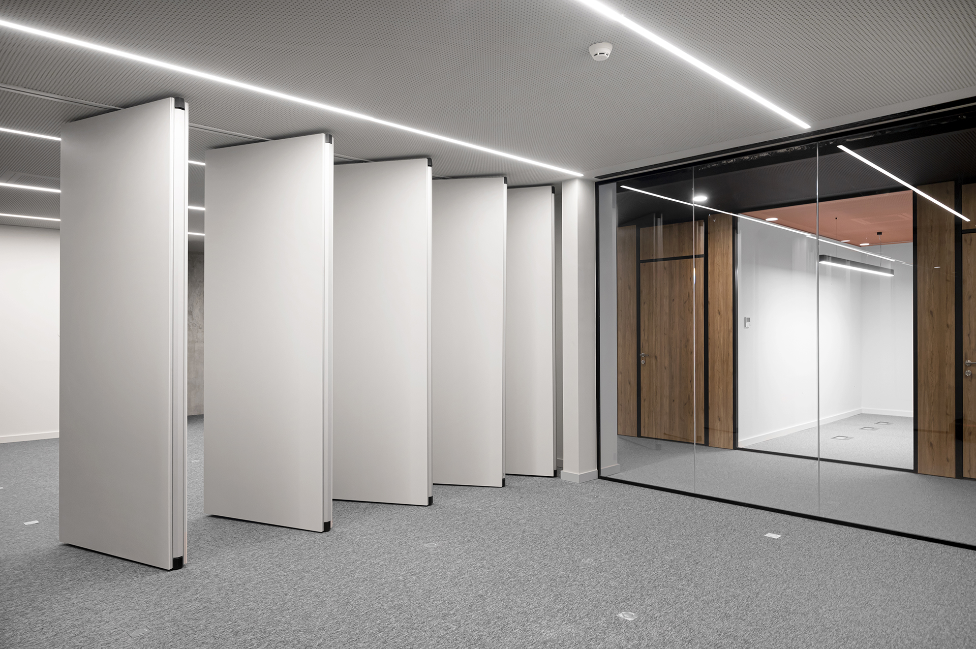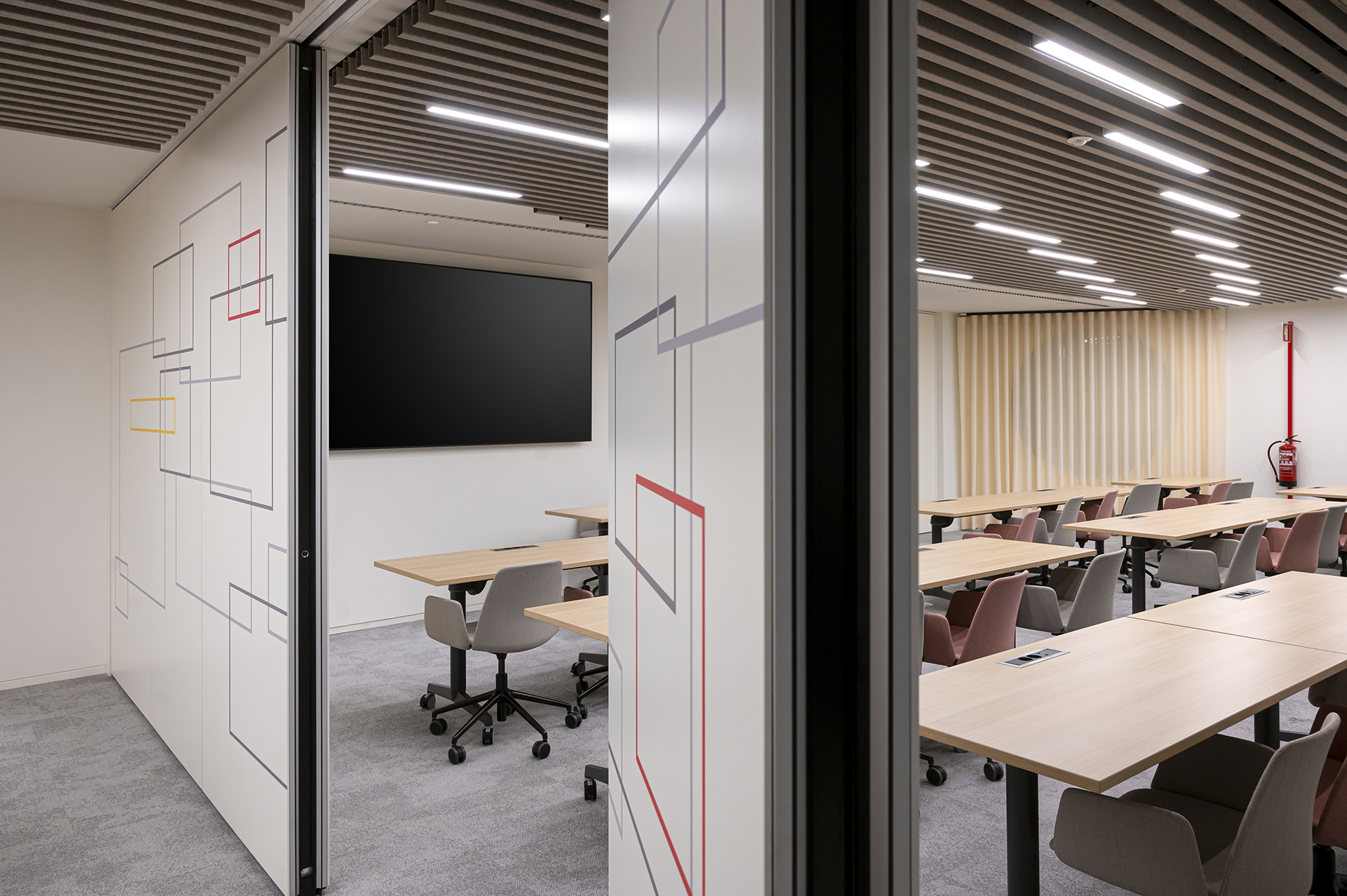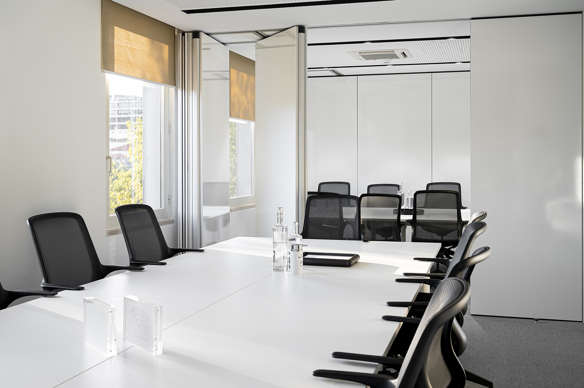 UNNOmove es un sistema integrado de paredes móviles, idealizado para dividir salas de reuniones, auditorios, entre otros, de forma rápida y eficaz, mediante un método que incluye la fijación de una estructura de acero galvanizado al forjado, sin necesidad de guías en el suelo.