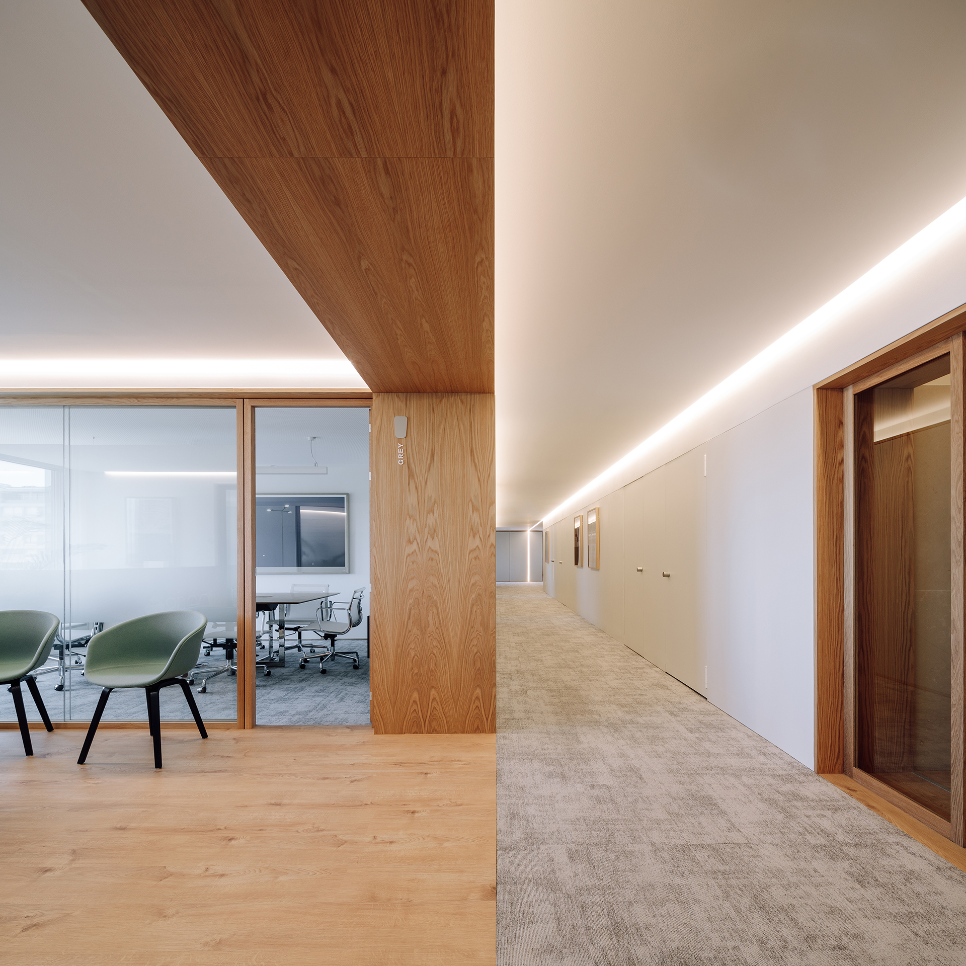 Madeira de Carvalho Americano e/ou perfis de alumínio anodizado à cor natural ou lacado nas cores standard RAL.